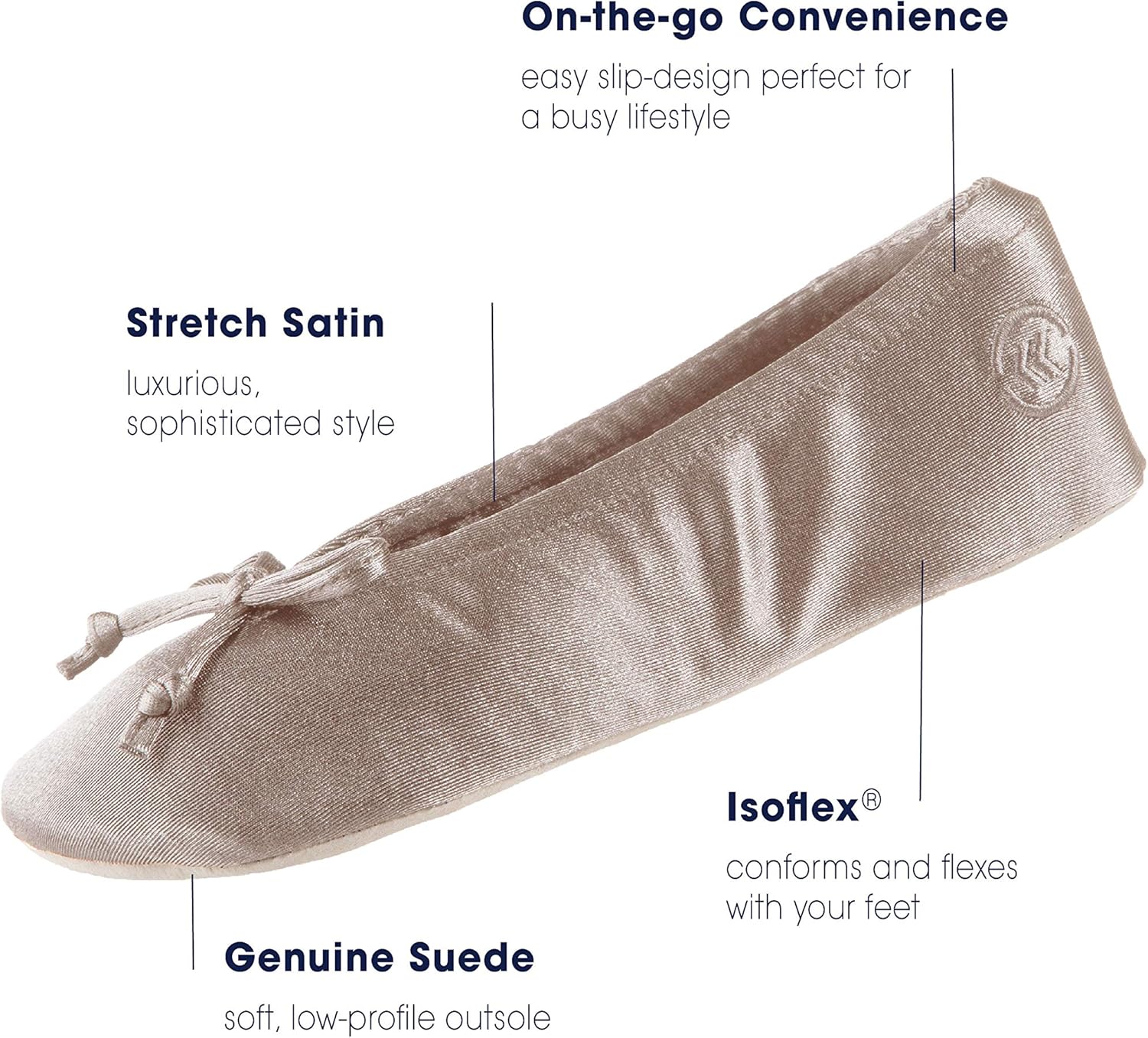 ISOTONER SATIN BALLERINA SLIPPER: Classic, timeless and supremely soft, isotoner ballerina slippers never go out of style. Transporting your feet to a relaxing spa with every step, these feminine ballet slippers for women are made with luxurious stretch satin for chic style and the perfect comfort fit. A super-soft cotton-blend terry provides breathability and cozy comfort all year round, and the lightweight women’s slippers are finished with an Isoflex comfort insole that conforms with your feet, and a genuine suede outsole for improved durability. Perfectly pretty for relaxing at home, these satin slippers are also ideal for weddings and events, and are a favorite with bridal parties. Simply fold the flexible travel slippers and toss them in your purse if you think your feet are in for a tough day – when your pumps start to pinch, just slip them off and replace them with these cushioned indoor shoes for ultimate comfort. The luxurious satin fabric and bow maintain your elegant look, and your sore, tired feet will thank you! The satin indoor slippers feature 4-way stretch fabric and an elasticized topline, and the comfy slippers are easy to keep hygienically clean, however much you wear them. When your new favorite slipper shoes need refreshing, just place them in the washing machine in cool water and dry flat away from heat. They will look and feel as good as new. This woman’s slipper runs small, so we recommend ordering the next size up for the most comfortable and flexible fit. For perfect pirouettes around the house, check out ISOTONER’s Classic Satin slipper. This sweet offering in fabric boasts a cushioned insole for comfort and an elasticized topline for a secure fit. Machine washability ensures easy wear.